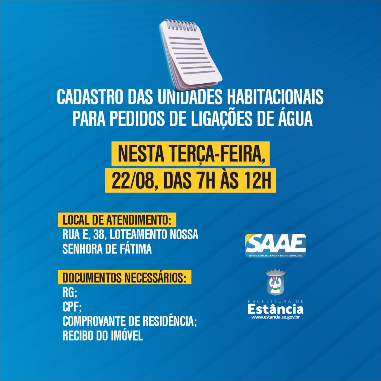 A ação, realizada pela Prefeitura de Estância, através do Serviço Autônomo de Água Esgoto - SAAE, em parceria com as secretarias municipais da Saúde e da Infraestrutura e Habitação, possibilita aos moradores solicitar pedidos de ligação de água e atualizar a base de dados do município.